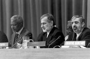 Seated next to Secretary-General Kofi Annan at the inaugural ceremony to elect the new G-77 chairman, Dr. Kharrazi said: "I am sure the Secretary-General shares our serious concern that in recent years there has been a general trend towards downplaying of international cooperation for development on the agenda of the international community, including the United Nations."